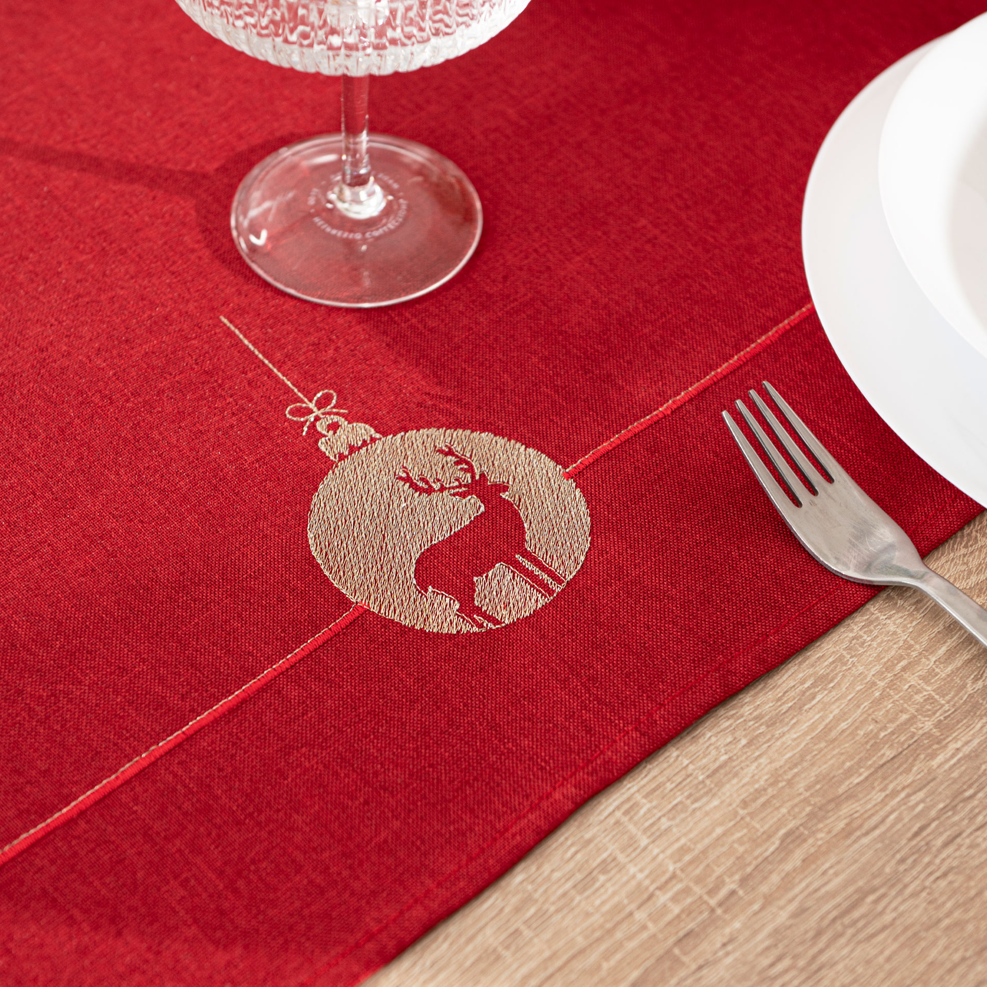 Stylowy bieżnik świąteczny to idealny dodatek do bożonarodzeniowych aranżacji stołu. Wykonany z wysokiej jakości tkaniny poliestrowej, łączy w sobie elegancję i trwałość. Dekoracyjny haft z motywem renifera wykonany błyszczącą złotą nicią nadaje mu wyjątkowego, świątecznego blasku.