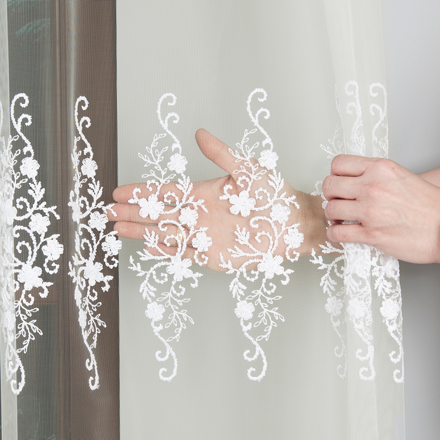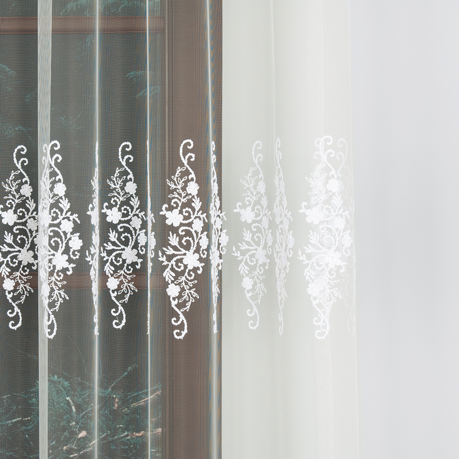 - Strukturalna głębia – dzięki wypukłości haftu firana zyskuje trójwymiarowy efekt, który pięknie prezentuje się w świetle dziennym.
