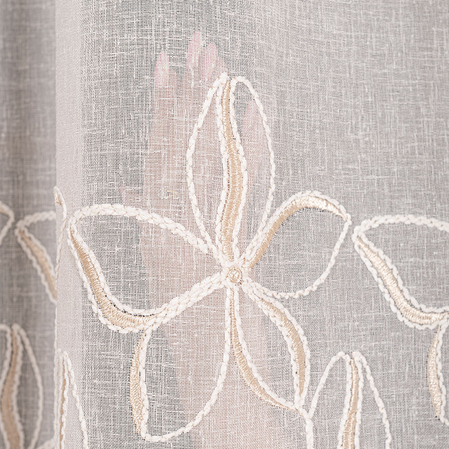 - Strukturalna głębia – dzięki wypukłości haftu firana zyskuje trójwymiarowy efekt, który pięknie prezentuje się w świetle dziennym.