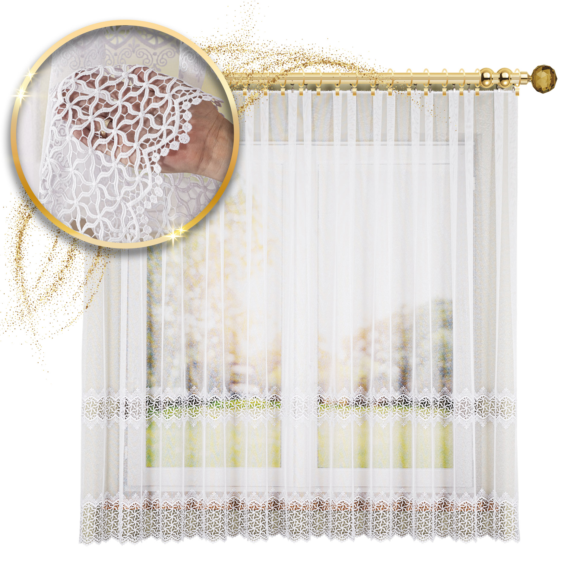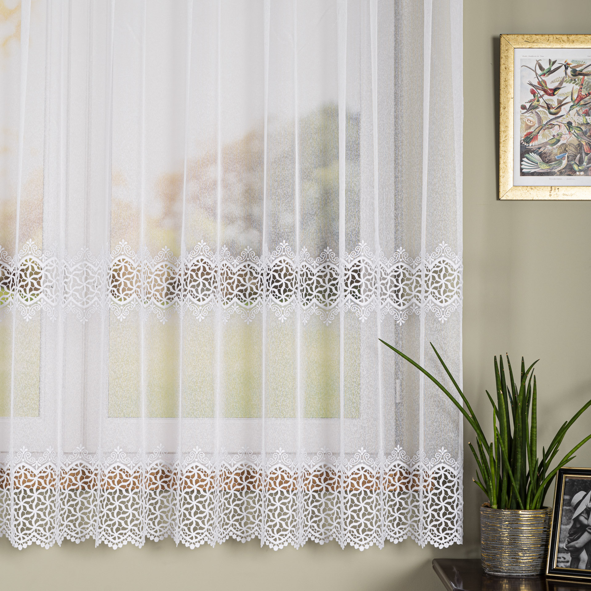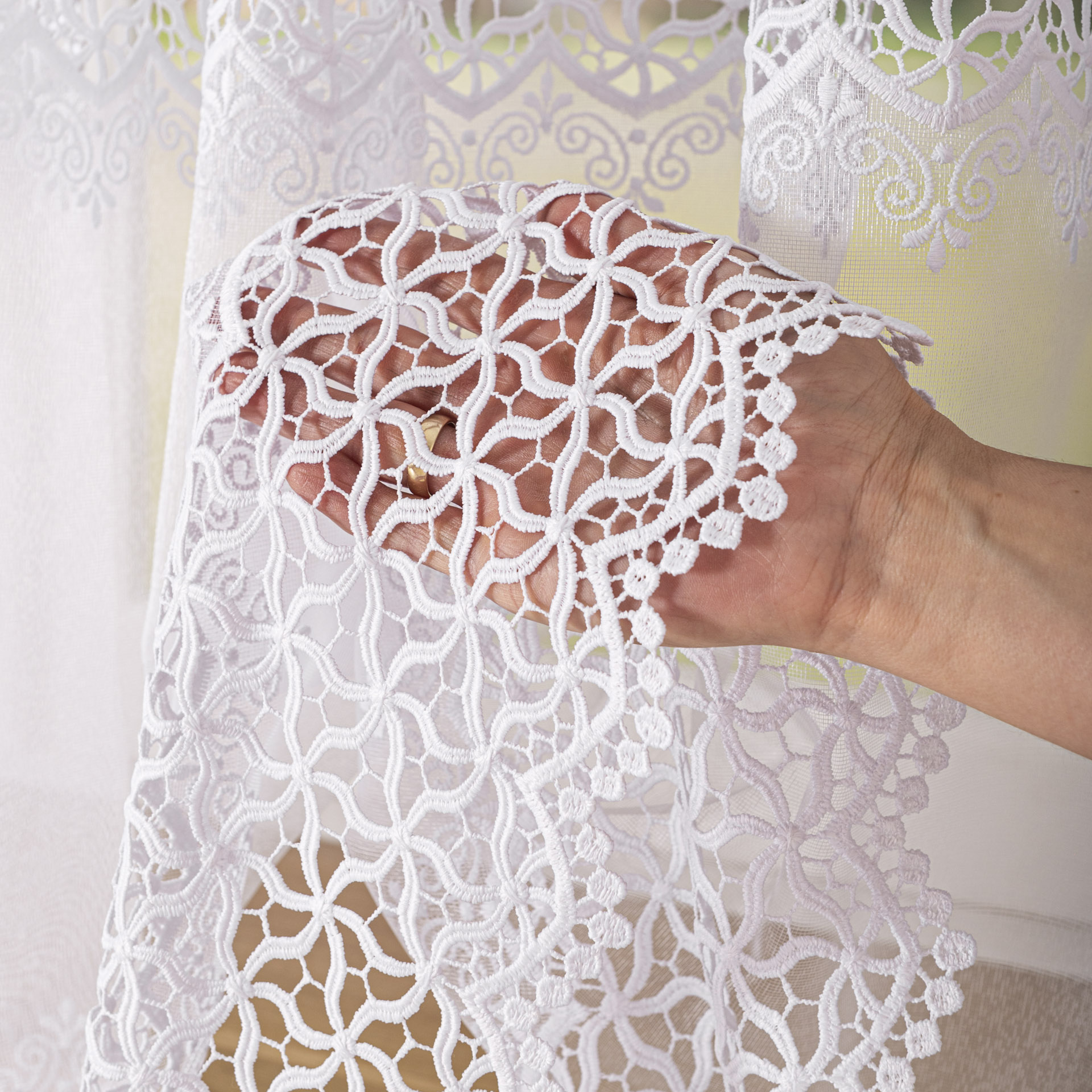 Firana z gipiurą doskonale komponuje się zarówno z klasycznymi, jak i nowoczesnymi aranżacjami wnętrz — idealna do salonu, sypialni, jadalni czy pokoju dziennego.