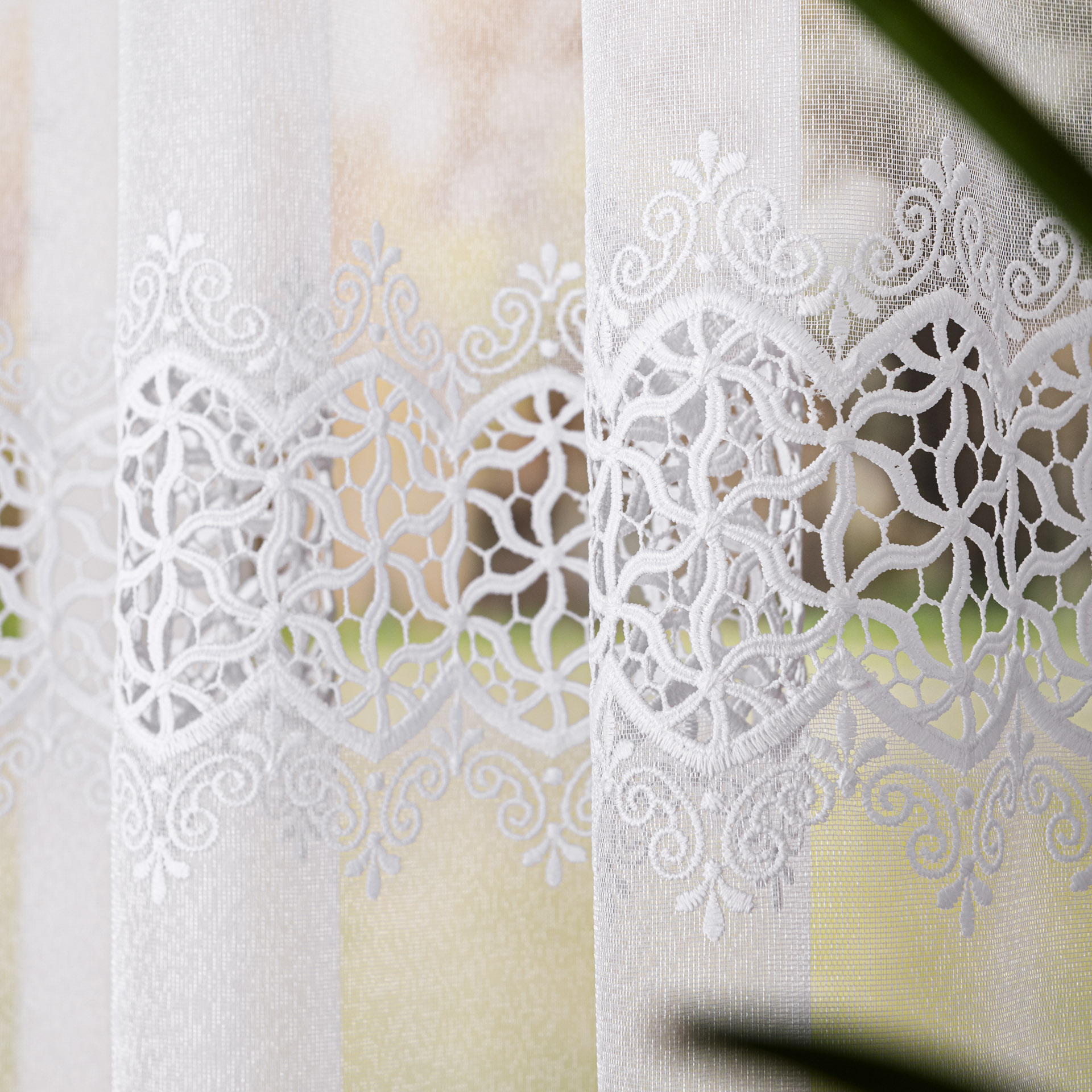 Elegancka firana z aplikacją gipiurową to wyjątkowa dekoracja okienna, która wprowadzi do wnętrza subtelność i ponadczasowy styl. Wykonana z markizety, tkaniny znanej z lekkości i doskonałej przepuszczalności światła z delikatną fakturą pięknie zdobi okno, nadając mu wytworny, a zarazem przytulny charakter.