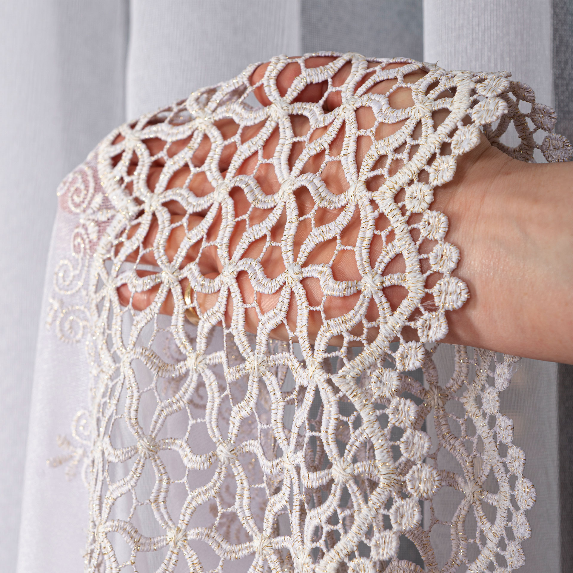 Firana z gipiurą doskonale komponuje się zarówno z klasycznymi, jak i nowoczesnymi aranżacjami wnętrz — idealna do salonu, sypialni, jadalni czy pokoju dziennego.