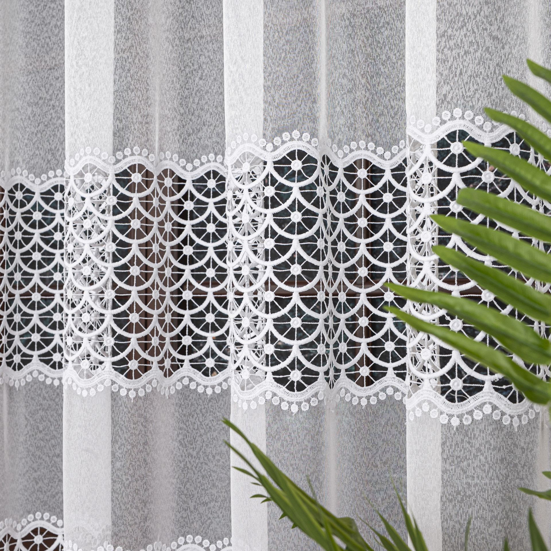 Elegancka firana z aplikacją gipiurową to wyjątkowa dekoracja okienna, która wprowadzi do wnętrza subtelność i ponadczasowy styl. Wykonana z markizety, tkaniny znanej z lekkości i doskonałej przepuszczalności światła z delikatną fakturą pięknie zdobi okno, nadając mu wytworny, a zarazem przytulny charakter.