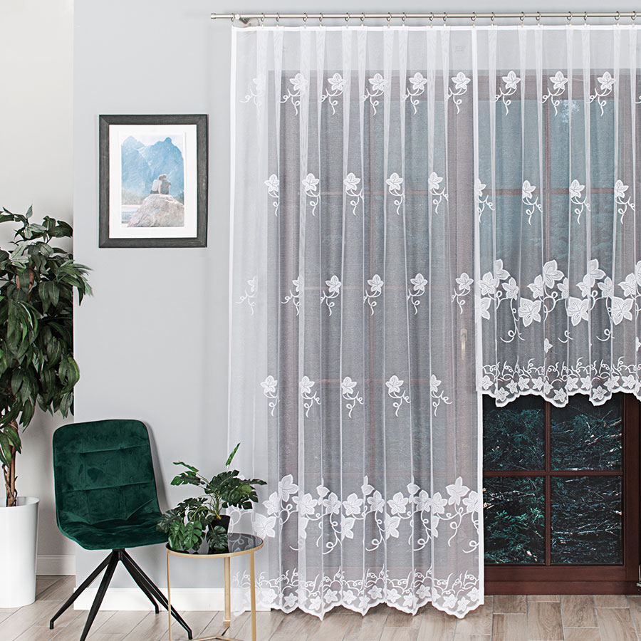 Klasyczny wzór firany pasuje do każdego pomieszczenia kuchni, sypialni, salonu czy jadalni.
