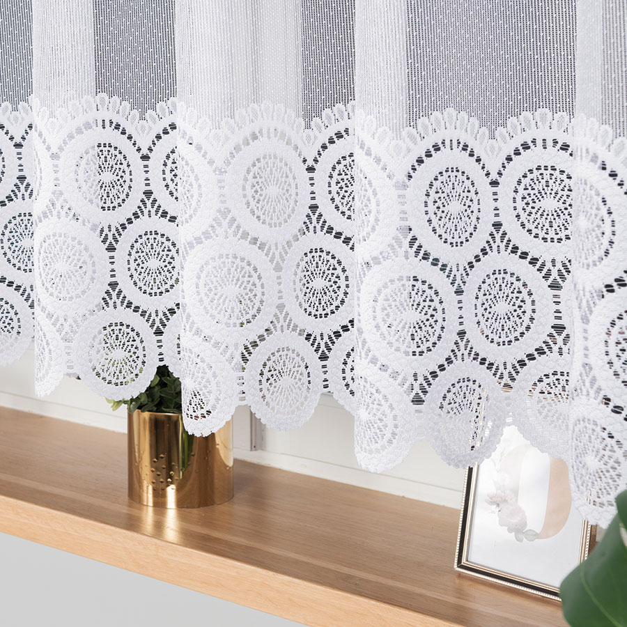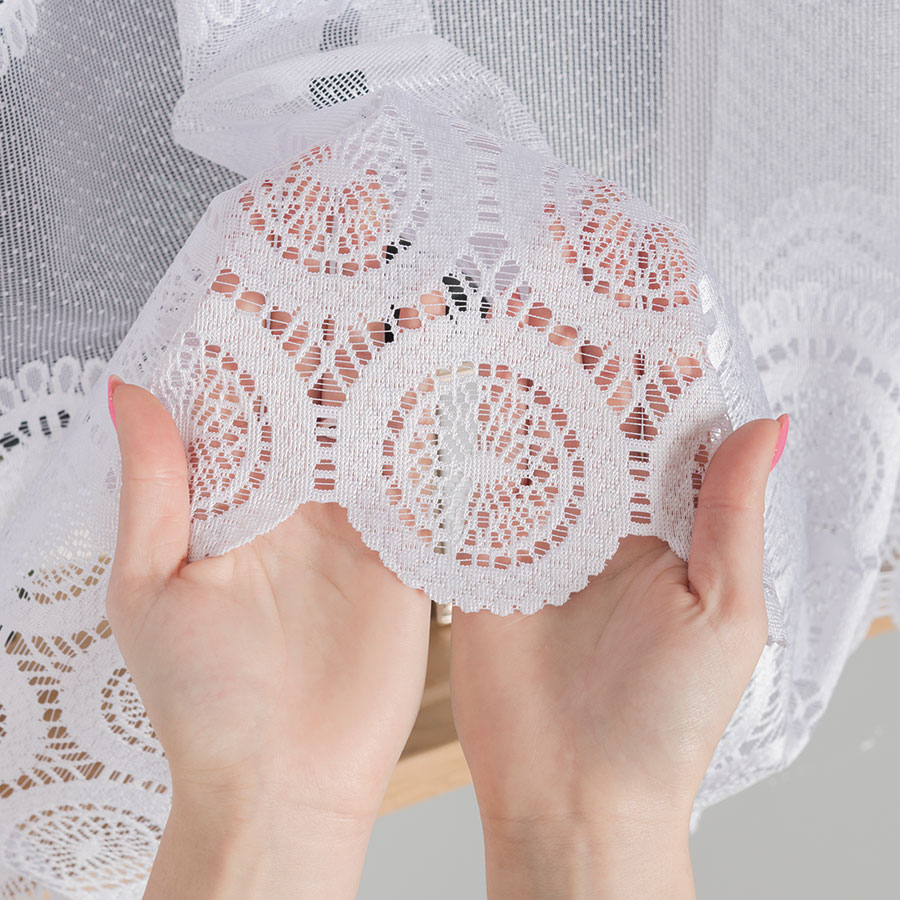 Tkanina żakardowa, z której wykonana jest ta firanka, charakteryzuje się wysoką jakością i trwałością. Jest ona delikatna w dotyku, co sprawia, że firanka prezentuje się bardzo elegancko i subtelnie. Dodatkowo, tkanina ta jest łatwa w utrzymaniu czystości, co pozwala na długotrwałe zachowanie jej pierwotnego wyglądu.