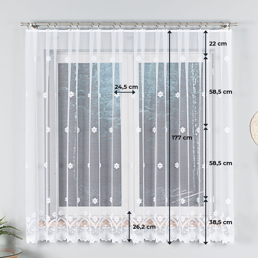 Jej modny i niepowtarzalny wzór sprawi, że wnętrze nabierze charakteru i wyjątkowego wyglądu. Dołożyliśmy starań, aby staranne wykonanie i uniwersalne zdobienie naszej firanki zachwyciło wszystkich Twoich domowników i gości.