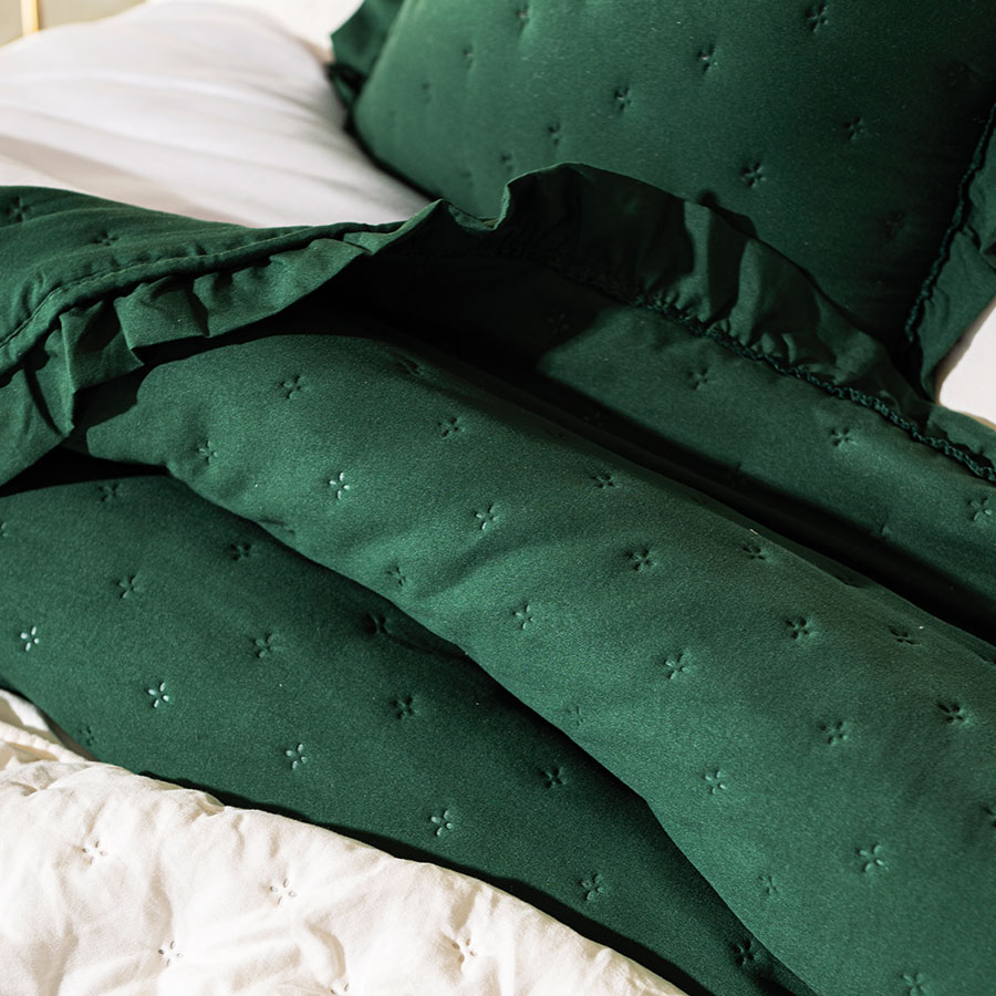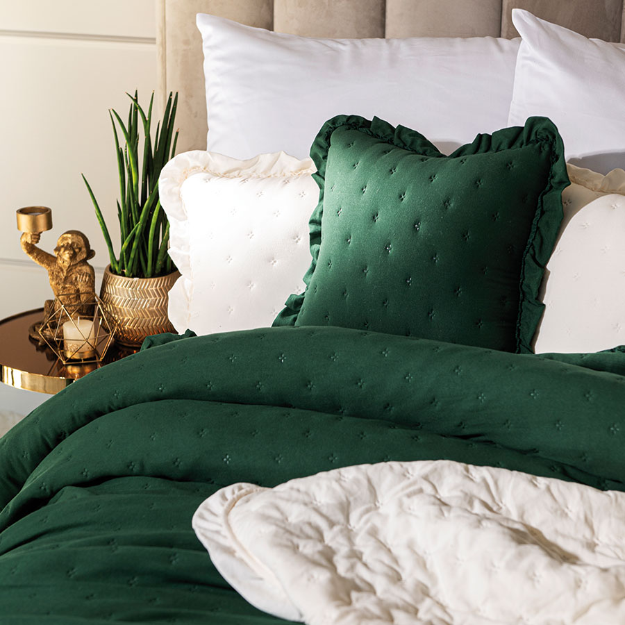 Elegancka narzuta na łóżko w kolorze zielonym, z subtelnym wzorem kropek oraz dekoracyjną falbaną. Wykonana z miękkiego w dotyku poliestru, zapewnia przytulność i komfort. Spód narzuty wykonano z mikrofibry o gramaturze 80 g/m², co czyni ją praktyczną i wytrzymałą. Wypełnienie o gramaturze 120 g/m² dodaje odpowiedniej objętości, a jej lekkość sprawia, że narzuta świetnie się układa, idealnie pasując do poszewek z tej samej serii.