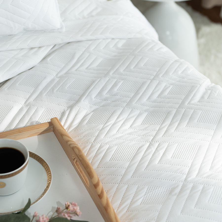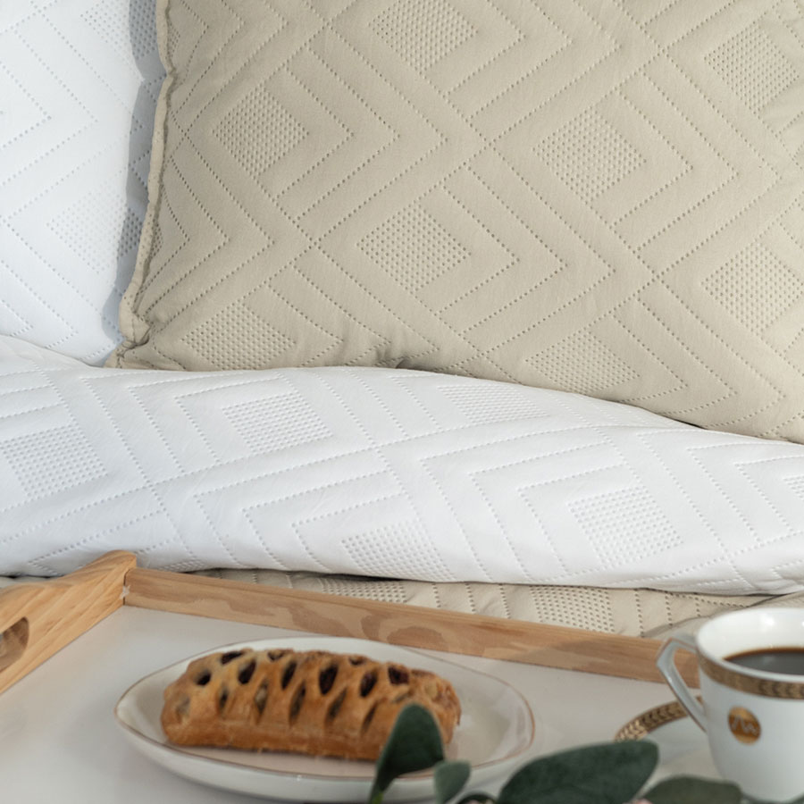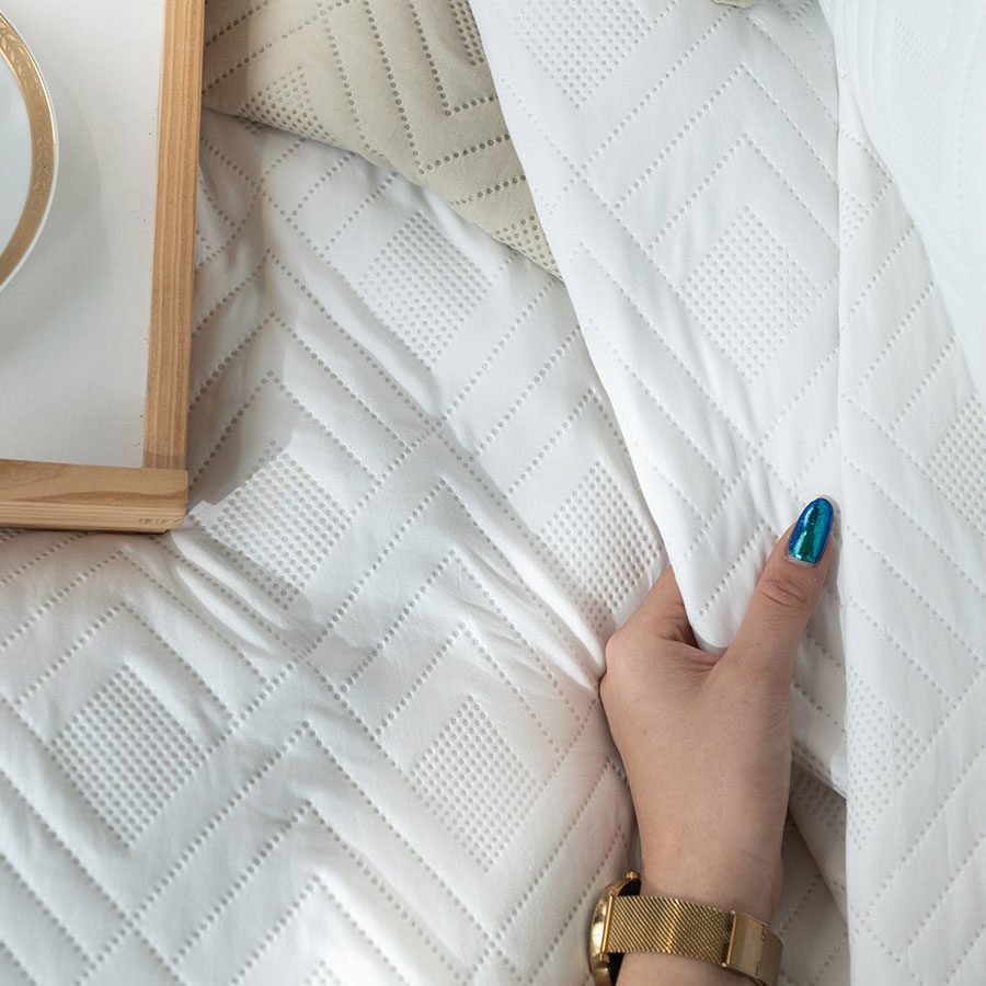 Stylowa narzuta na łóżko w kolorze białym z eleganckim wzorem jodełki. Narzuta jest pikowana metodą hot press, co gwarantuje precyzyjne wykonanie i trwałość wzoru. Wykonana z poliestru, ze spodem z miękkiej mikrofibry, zapewnia komfort i estetyczny wygląd. Świetnie komponuje się z poszewkami z tej samej serii, tworząc harmonijną dekorację sypialni.