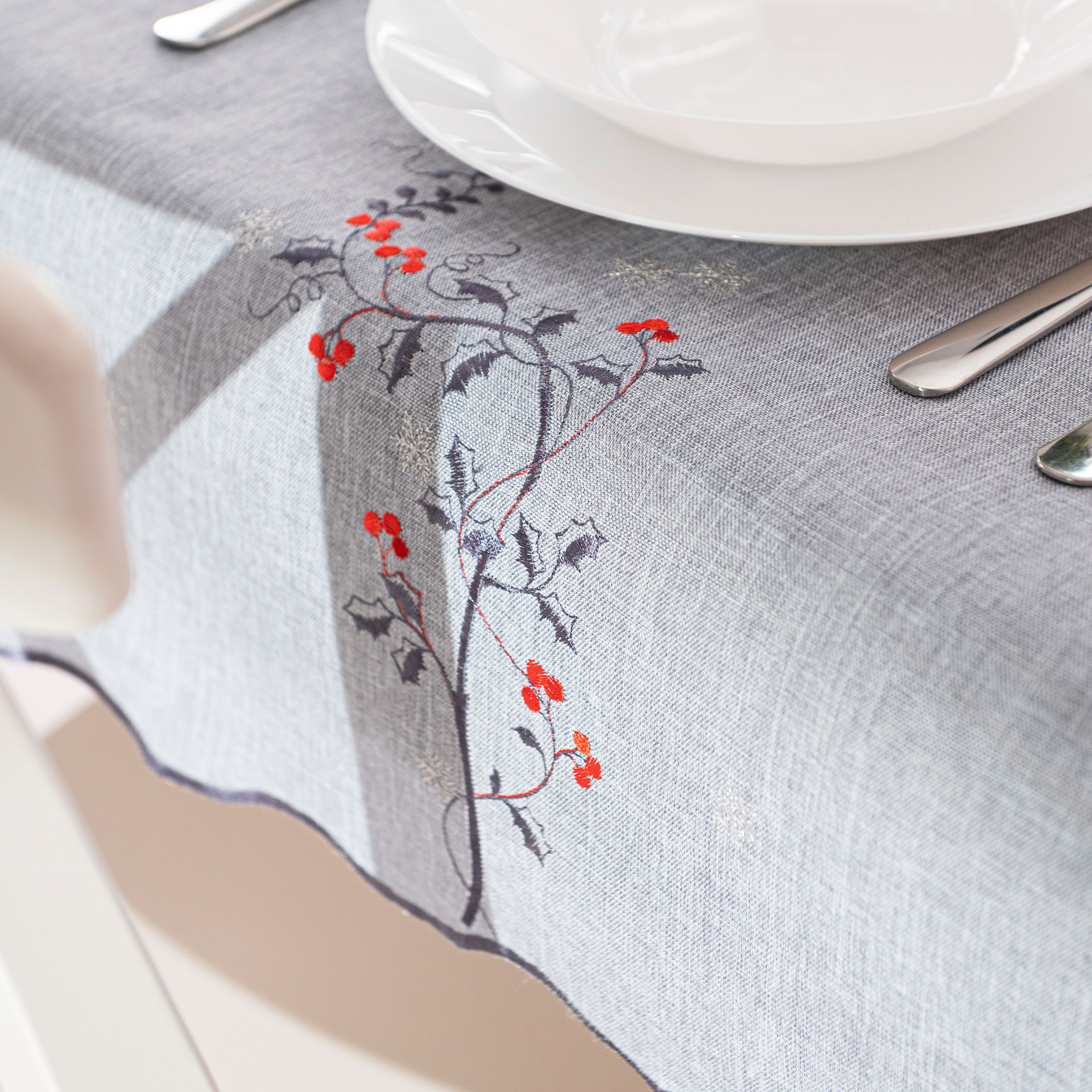 OBRUS ŚWIĄTECZNY Z HAFTEM JARZĘBINA 140x180cm szary