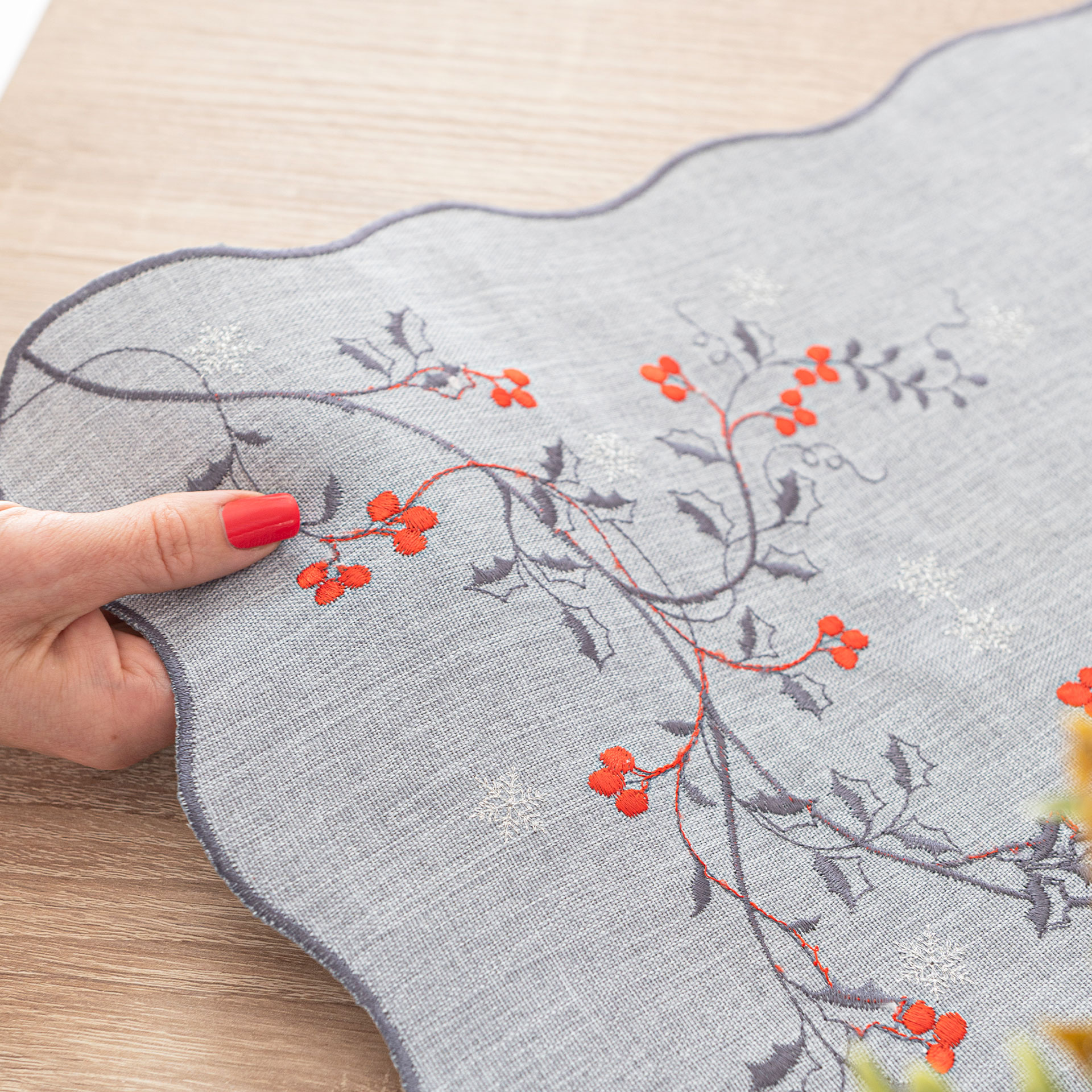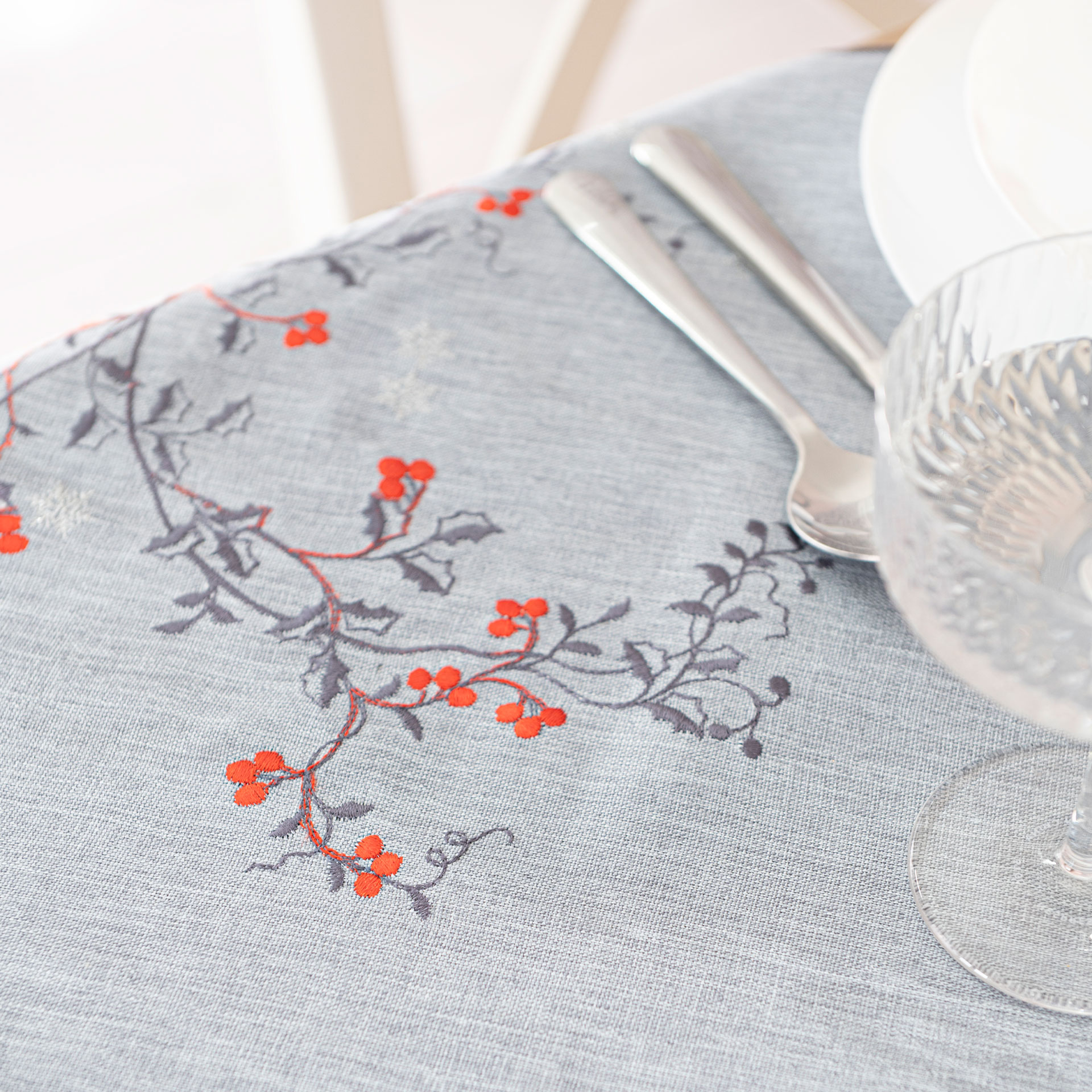 OBRUS ŚWIĄTECZNY Z HAFTEM JARZĘBINA 140x220cm szary