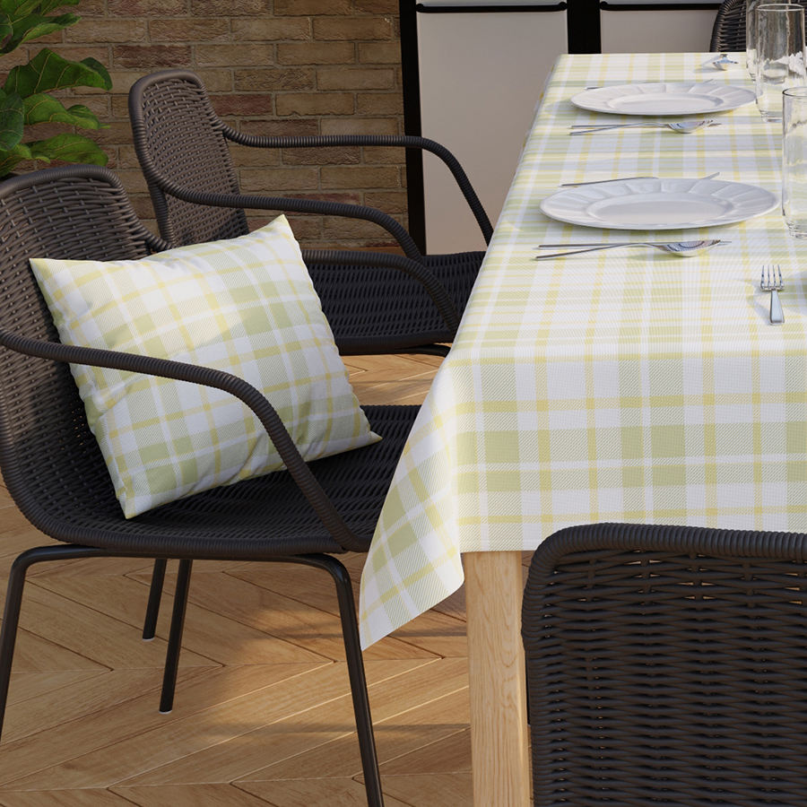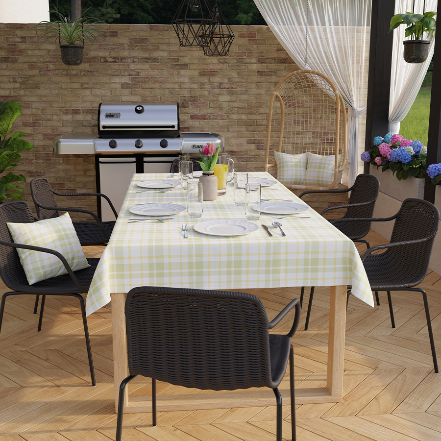 - Wodoodporność: Specjalny podkład zapewnia ochronę przed wilgocią, co czyni tę tkaninę idealną do użytku w miejscach narażonych na kontakt z wodą, takich jak kuchnie, jadalnie czy tarasy.