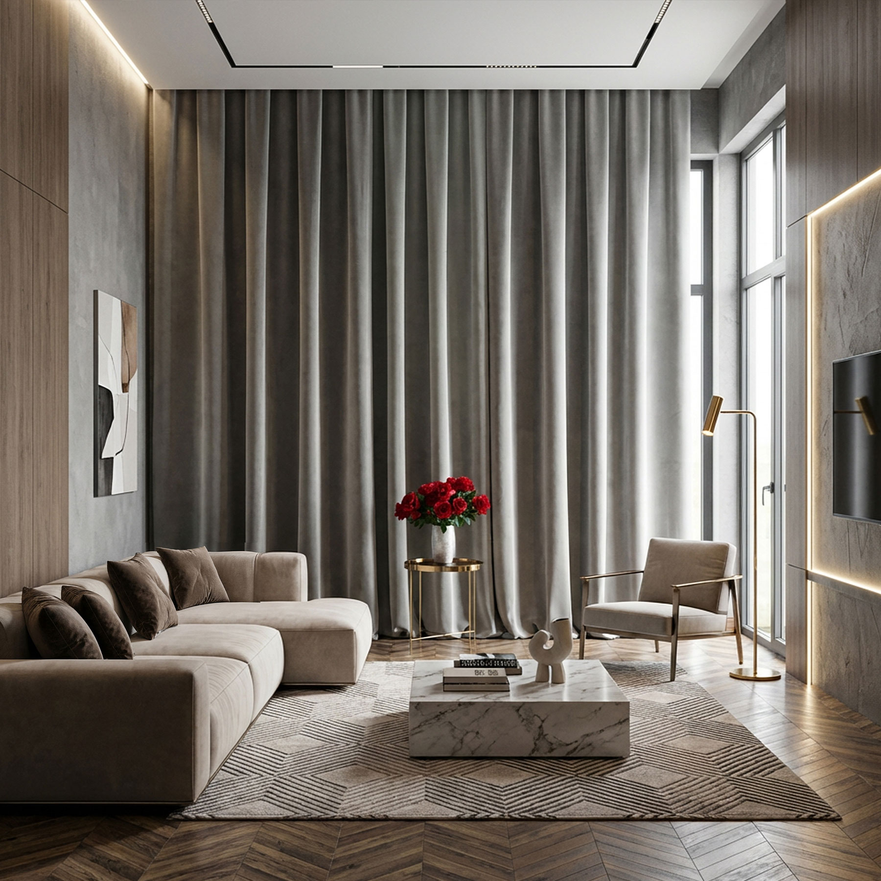 Materiał jest półzaciemniający, co pozwala ograniczyć ilość światła wpadającego do pomieszczenia, zapewniając komfort i prywatność. Wysokość 320 cm sprawia, że tkanina idealnie nadaje się do wysokich okien, aranżacji typu „od sufitu do podłogi” oraz nowoczesnych wnętrz.