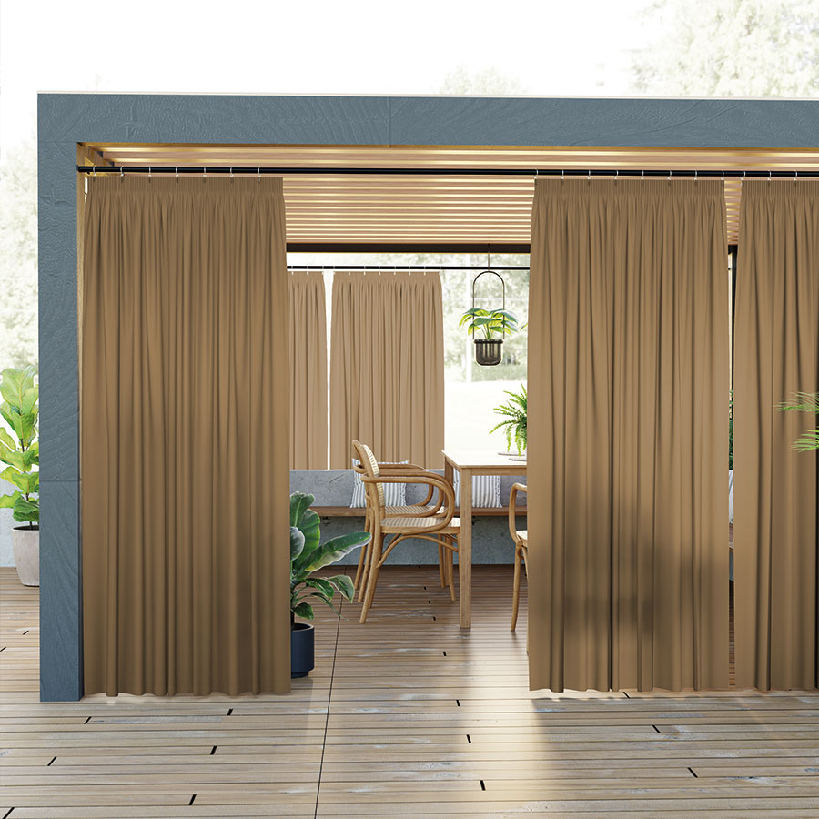 Zasłona tarasowa Gardenia przeznaczona do użytku na zewnątrz. Dzięki specjalnemu wykończeniu powłoką akrylową, tkanina jest wyjątkowo odporna na różnorodne czynniki zewnętrzne. Wodoodporne wykończenie skutecznie chroni przed deszczem i wilgocią, co sprawia, że zasłona idealnie nadaje się do stosowania na tarasie, pergoli, balkonie czy w altanie.